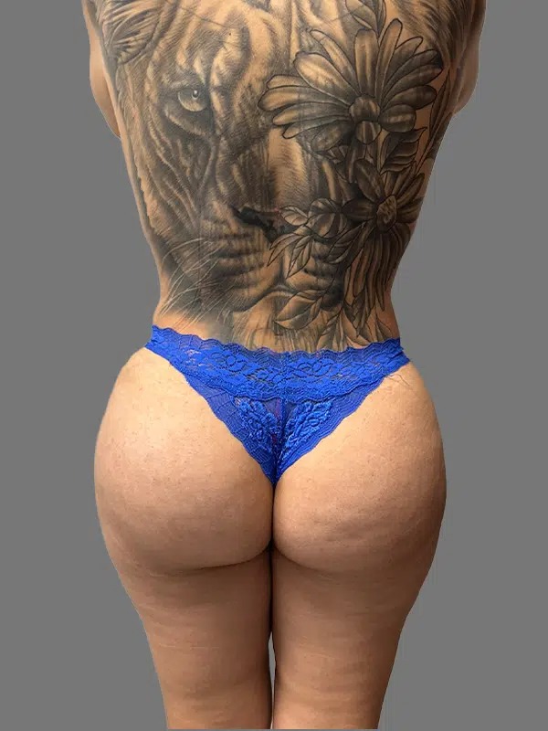This patient wanted a more voluptuous butt, curvier figure, and preservation of her intricate tattoo. Dr. Sarcia did a fantastic job accommodating all of these desires.