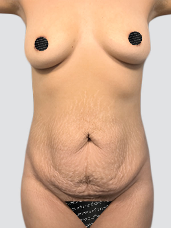 Unfortunately, this patient (like so many women) was unhappy with her stomach after having children. We removed her stretched skin and restored her belly to its former glory with a tummy tuck. Her stomach now looks flat and toned with a perfectly placed belly button.